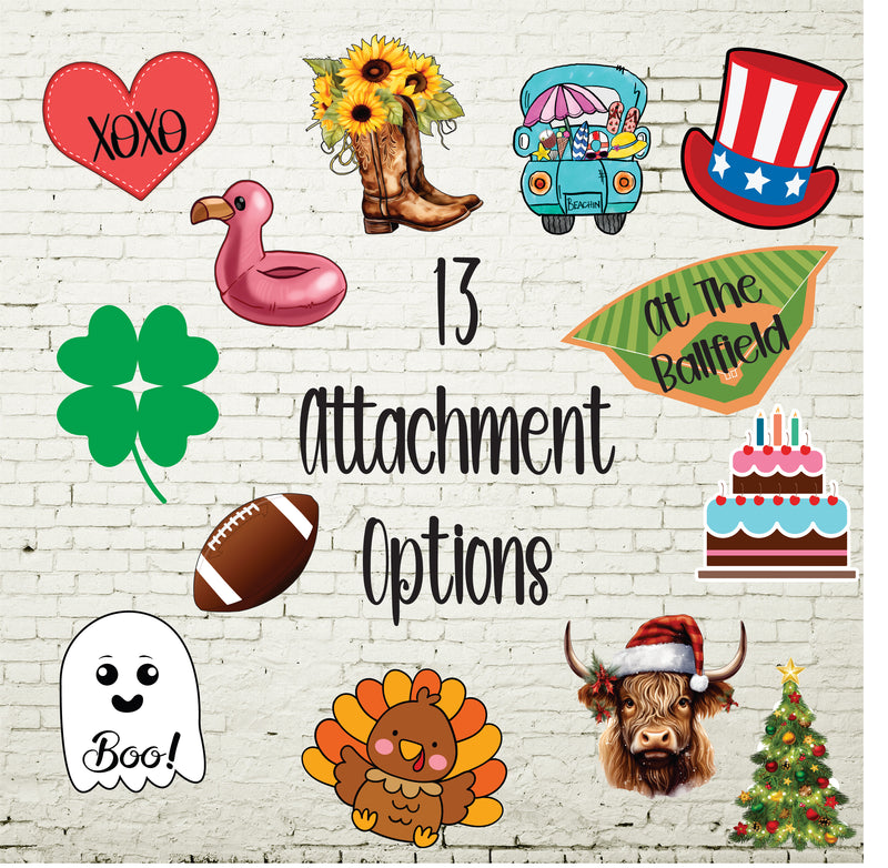 You can choose from 1 - 13 different style attachments to keep your front door fresh every season.